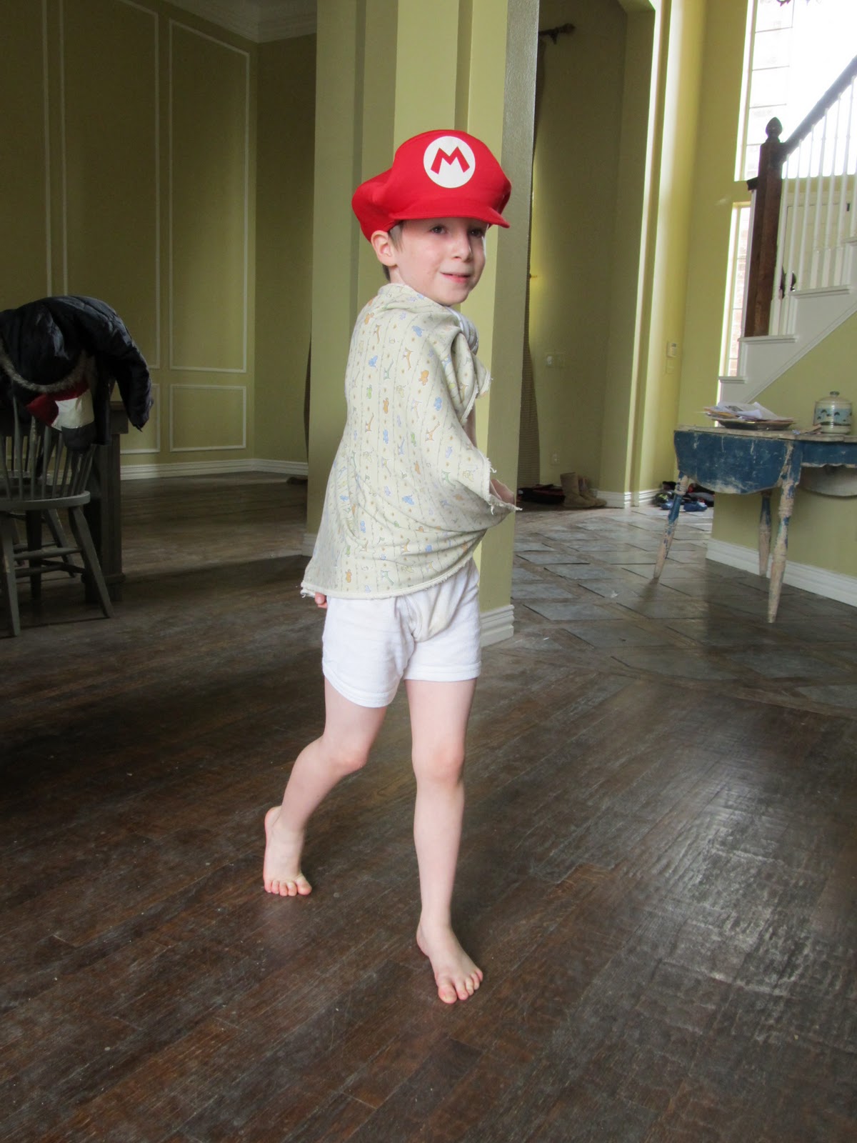 | Foam Mario Bros. hat, white shorts, and a blankie. It's what all the hip people are wearing this season, apparently. |